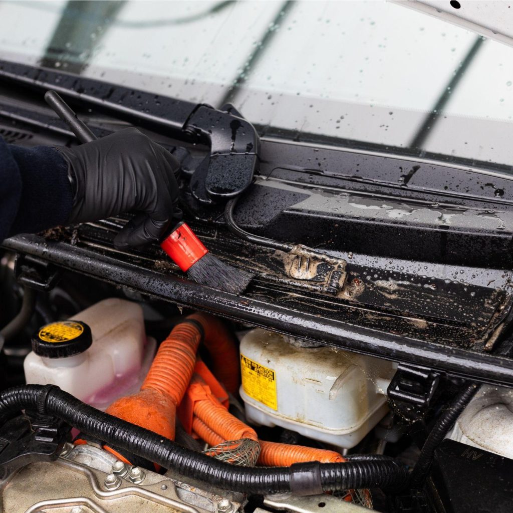 Bij het wassen bieden we ook de mogelijkheid om de motorruimte te laten reinigen. De motorruimte en de binnenzijde van de motorkap worden ingespoten met MV-40. Dit krachtige middel zorgt ervoor dat olie- en andere vervuilingsresten onder de motorkap effectief worden verwijderd. Na het aanbrengen wordt het middel in de motorruimte geborsteld, waarna zorgvuldig wordt afgespoten. Na het droog zemen van de motorruimte wordt Motor-Fresh aangebracht, wat doffe delen een langdurige natuurlijke glans geeft.